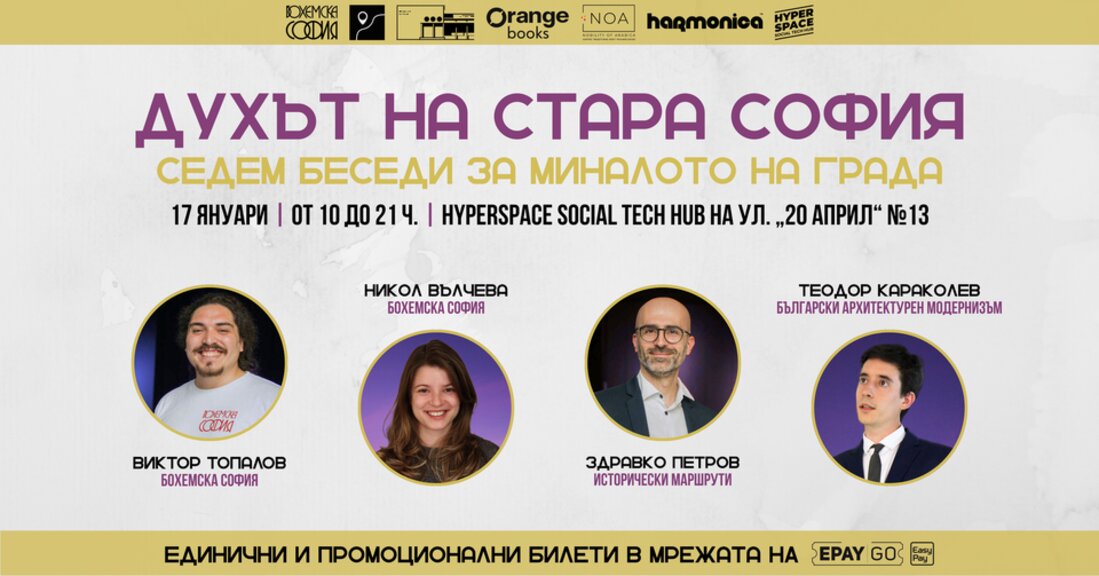 С Виктор Топалов и Никол Вълчева от "Бохемска София" разговаряме в "Нашият ден" за исторически маршрути, бохемски спомени, и какво могат да ни разкрият те за настоящето на столицата. Повод за срещата в ефир е предстоящият цикъл от лекции в рамките на форума "Духът на стара София." – на 17 януари от 10 ч. до 21 ч.