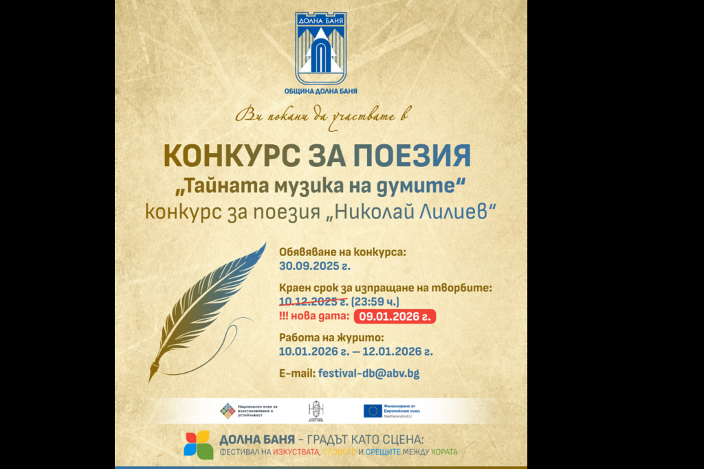 Крайният срок за участие в Националния поетичен конкурс "Тайната музика на думите" – конкурс за поезия "Николай Лилиев" е днес. Конкурсът се провежда в рамките на проект "Долна Баня – градът като сцена: Фестивал на изкуствата, словото и срещите между хората", реализиран от Община Долна баня.