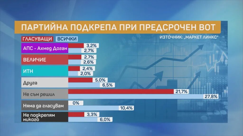 Под 4-процентовата бариера за влизане в Народното събрание остават партията на Ахмед Доган - АПС, която събира едва 3,2 процента; партия "Величие", която би спечелила 2,7% и "Има такъв народ", която събира 2,4 на сто.